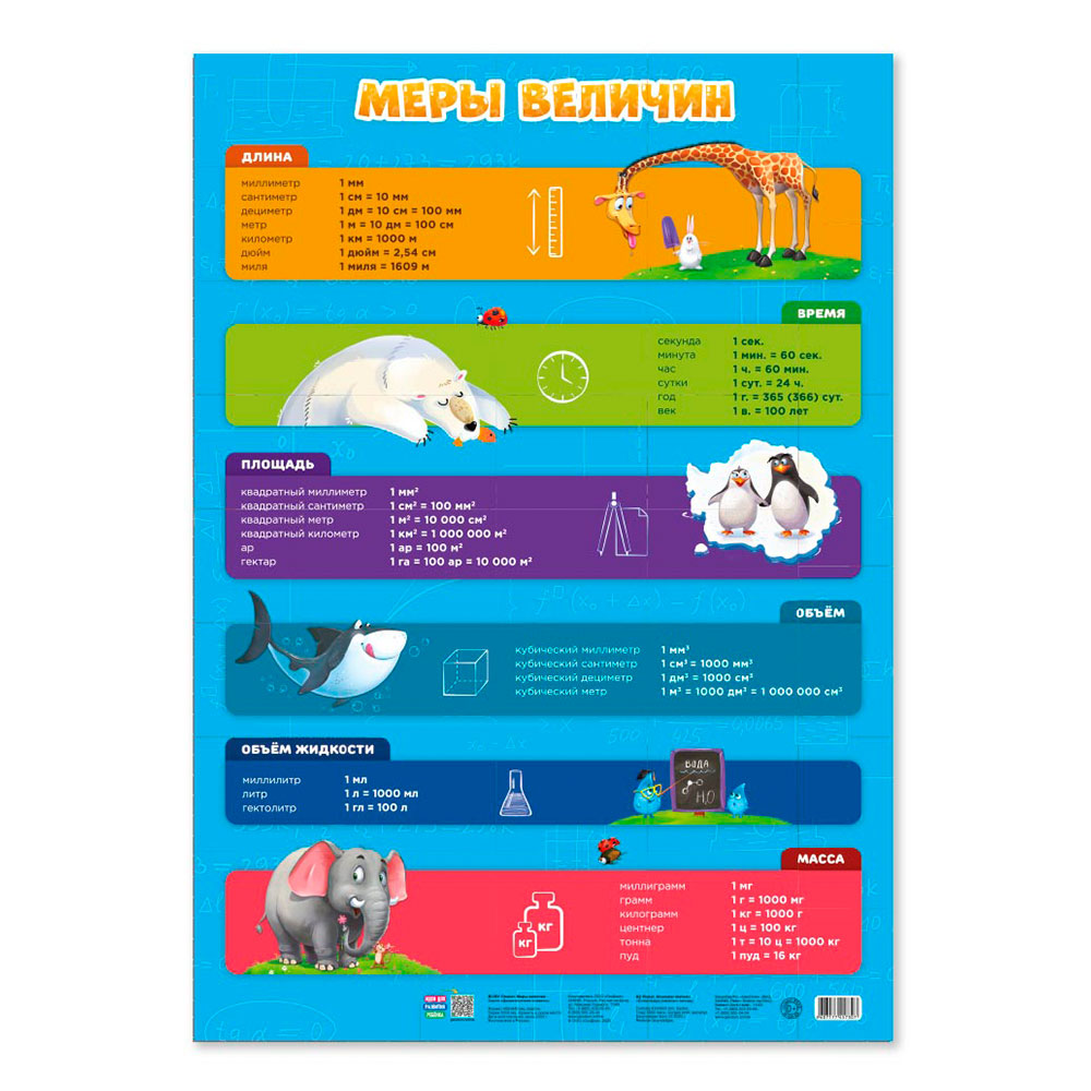 Красочный обучающий плакат “Меры величин” - незаменимый помощник для детей начальной школы! Плакат даёт представление о единицах измерения и мерах основных величин: длины, массы, площади и времени. Весёлые иллюстрации не дадут скучать детям.