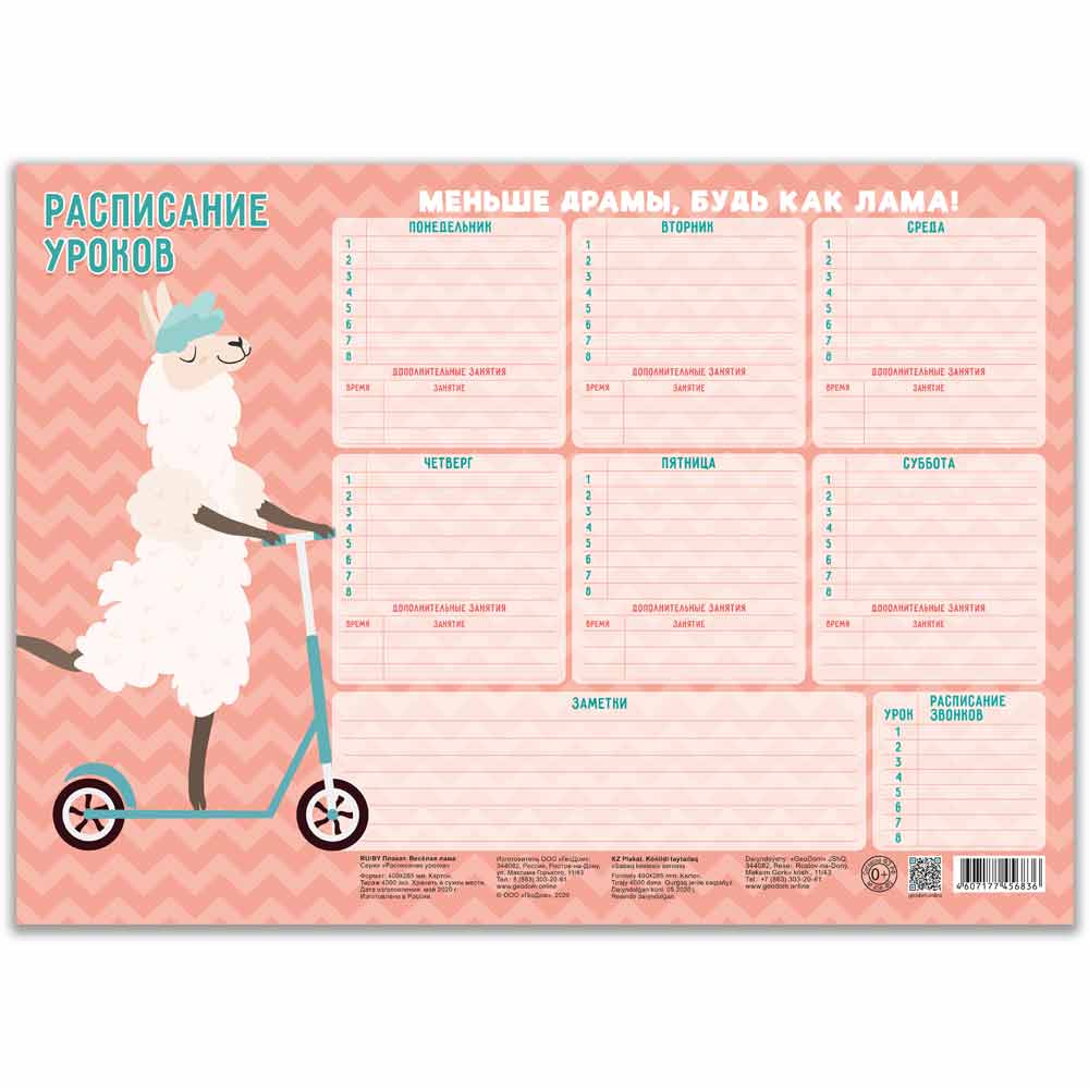 Расписание уроков необходимо каждому ученику! Это незаменимый помощник ребенка в учебном процессе, который приучает младших школьников к организованности, аккуратности и последовательности действий. План уроков, время звонков и даже пометки о дополнительных занятиях после уроков - всегда перед глазами. С помощью нашего расписания, школьник не забудет сделать домашнее задание и правильно соберет необходимые книги и тетради.