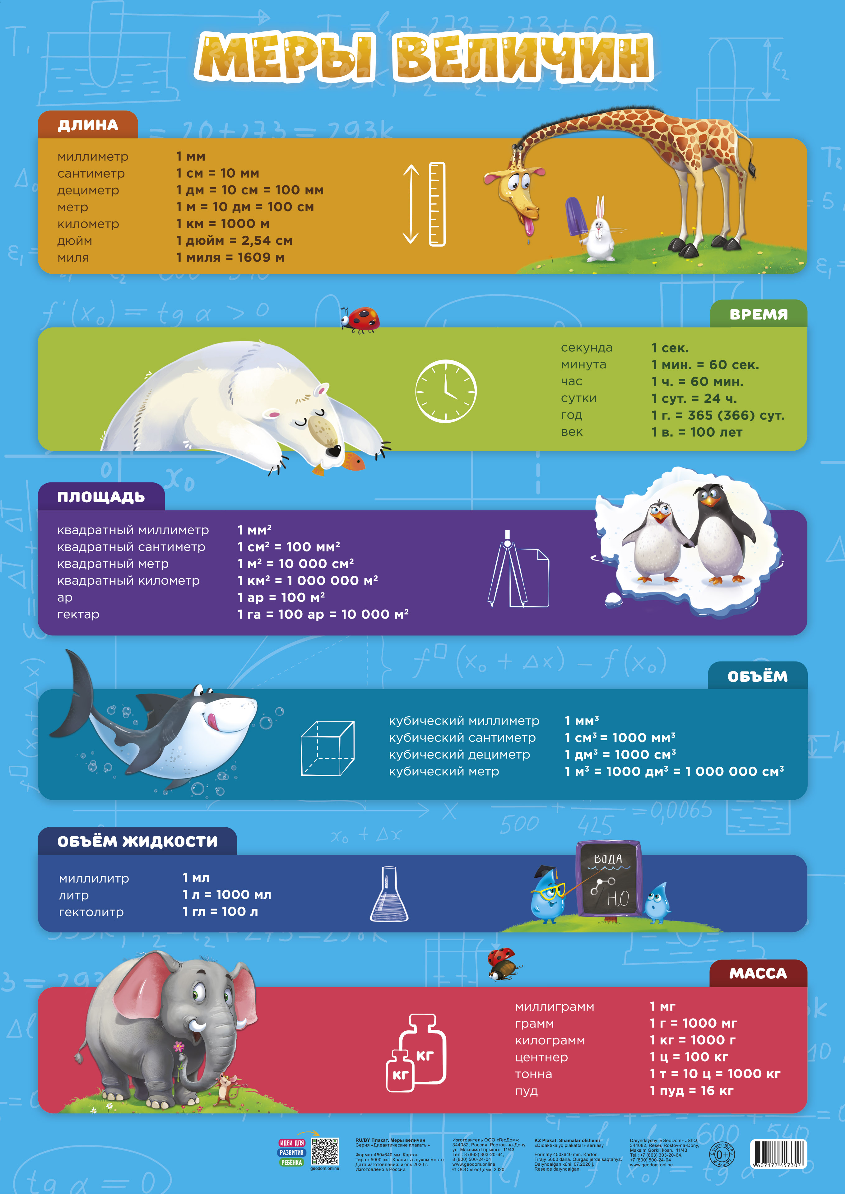 Красочный обучающий плакат “Меры величин” - незаменимый помощник для детей начальной школы! Плакат даёт представление о единицах измерения и мерах основных величин: длины, массы, площади и времени. Весёлые иллюстрации не дадут скучать детям.