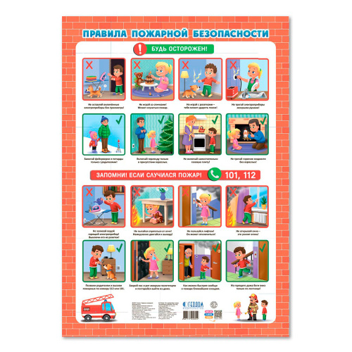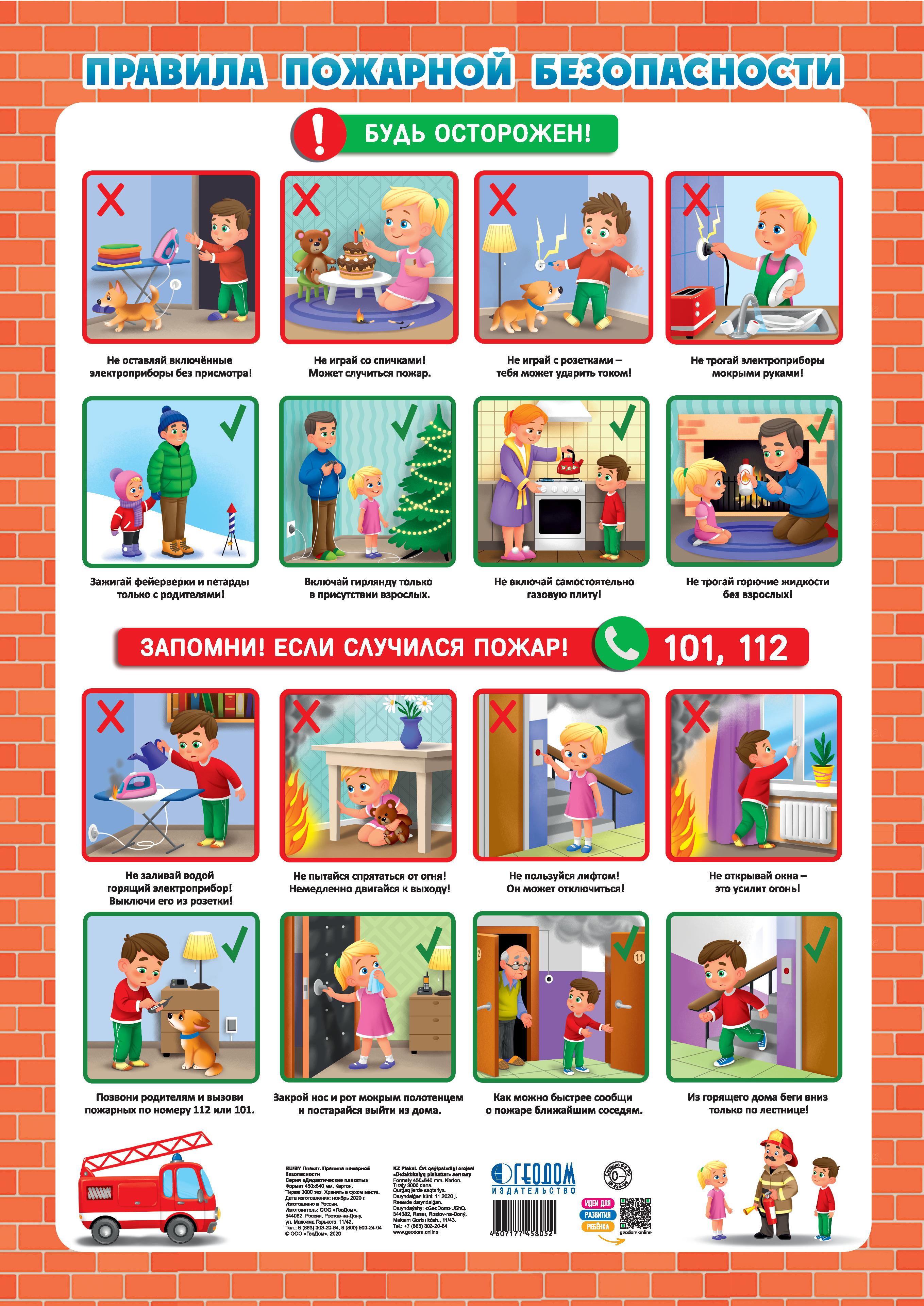 Плакат «Правила пожарной безопасности» с яркими картинками, привлекающими внимание детей, понадобится для оформления класса в школе, для детского сада и дома в качестве наглядного пособия. Обучающий плакат познакомит детей с причинами возникновения пожара и правилами поведения при его наступлении.