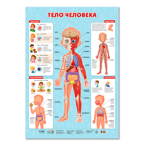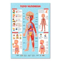 Плакат «Тело человека» даёт представление о внешнем и внутреннем строении тела человека. Ребёнок узнает, что человеческое тело состоит из нескольких систем, включающих разные органы. Каждый орган выполняет определенные функции. Ребёнок сможет понять, как органы реагируют на внешние воздействия и как происходят основные процессы в организме. Плакат предназначен для дошкольных и школьных учреждений, домашнего пользования.