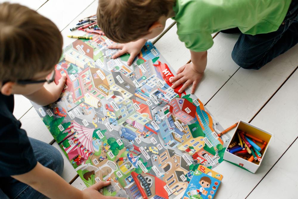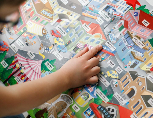 Это наглядное пособие для детей и их родителей, на котором изображен самый настоящий город с его жителями и развитой инфраструктурой: кафе, книжный, полиция, парк, кино, цветочный магазин, парикмахерская, аптека. Все здания и предметы подписаны на английском и русском языках.