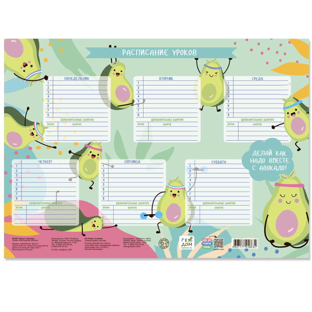 Расписание уроков «Авокадо» необходимо каждому ученику. Это важный и незаменимый помощник ребенка в учебном процессе, который приучает школьников к организованности и последовательности действий. План занятий, время звонков и даже пометки о дополнительных заданиях после уроков - всегда перед глазами, поэтому школьник не забудет сделать домашнее задание и не оставит дома необходимые для занятий книги и тетради.