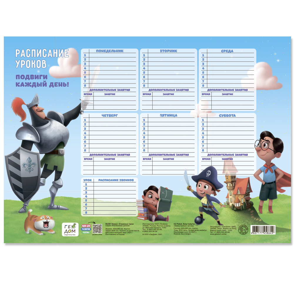 Расписание уроков «Отважные герои» необходимо каждому ученику. Это важный и незаменимый помощник ребенка в учебном процессе, который приучает школьников к организованности и последовательности действий. План занятий, время звонков и даже пометки о дополнительных заданиях после уроков - всегда перед глазами, поэтому школьник не забудет сделать домашнее задание и не оставит дома необходимые для занятий книги и тетради.