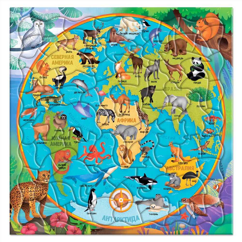 Какие животные обитают в Африке? А какие – в Австралии? Правильно сложите все фрагменты – и узнаете! На красочной карте мира – разные континенты и их обитатели. Находите животных среди элементов пазла – собирайте, играйте и рассматривайте! Пазл тренирует мелкую моторику, внимание, память и способствует развитию образного мышления. А благодаря рамке и фрагментам из плотного картона пазл удобно хранить и брать с собой. Рекомендованный возраст: 6+.