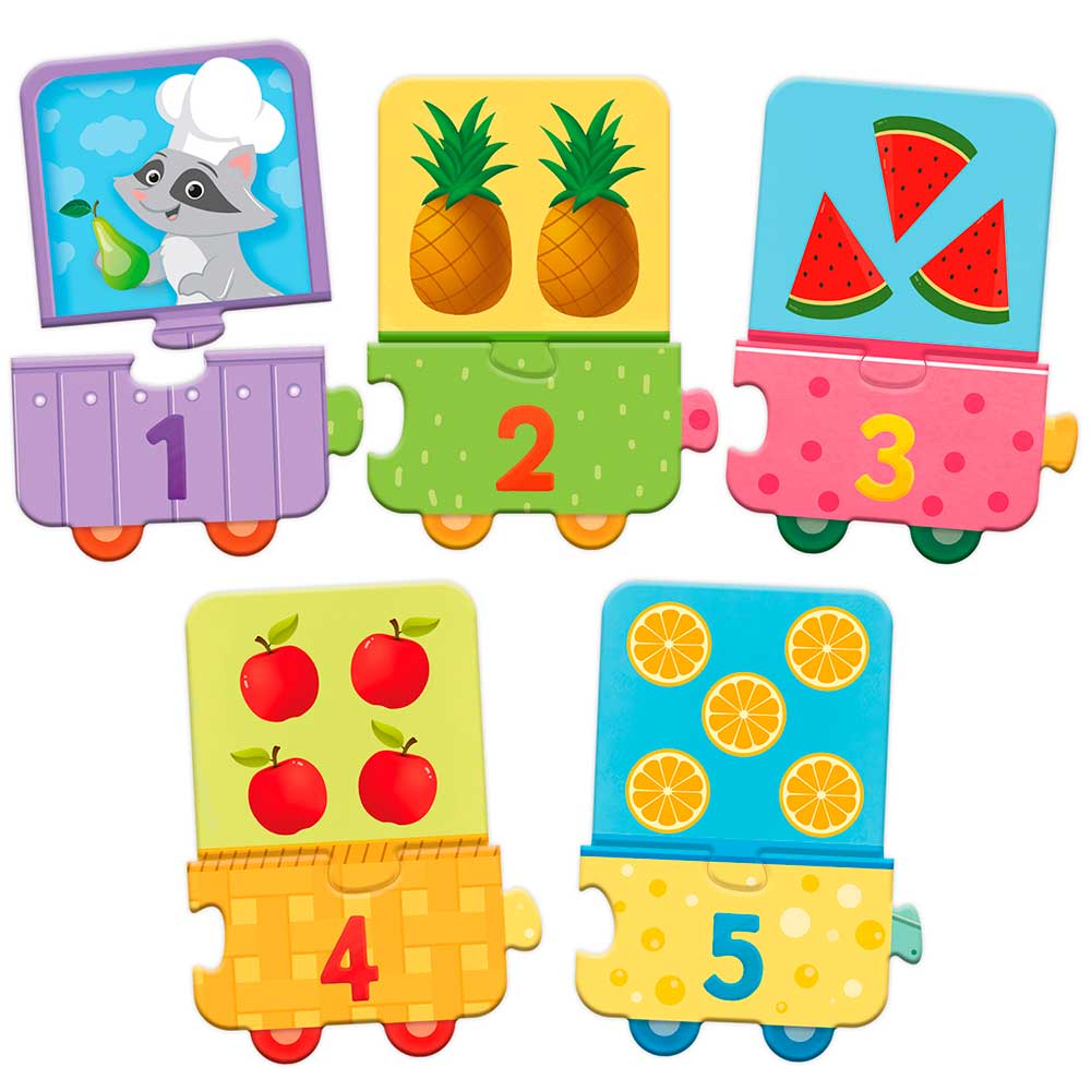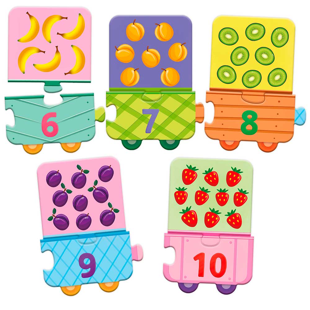 Пазл-паровозик – оригинальное воплощение популярной головоломки, любимой детьми разного возраста, начиная с самого младшего. Макси-пазлы для детей «Вкусный счет» – это 10 волшебных фруктовых вагончиков-пазлов с уникальными замочками, которые не дадут ребенку ошибиться при сборке. Элементы необходимо соотнести по принципу: цифра + обозначаемое количество фруктов (яблок, бананов, киви). Элементы изготовлены из плотного картона с ламинацией, которая долго сохраняет презентабельный вид пазла.