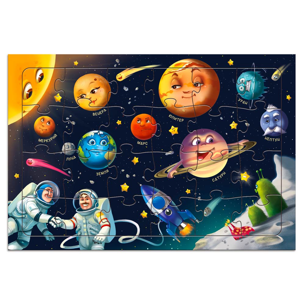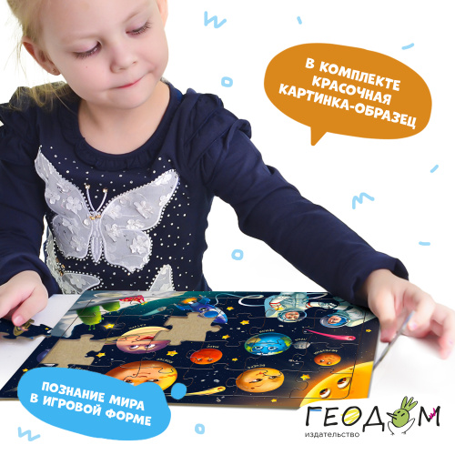 Этот пазл – для самых маленьких любителей космоса. Правильно сложи все элементы – и увидишь планеты, звёзды и даже инопланетян! Собирай, играй и рассматривай красочную картинку! Пазл тренирует мелкую моторику, внимание, память и способствует развитию образного мышления. А благодаря рамке и фрагментам из плотного картона пазл удобно хранить и брать с собой. Рекомендованный возраст: 3+.