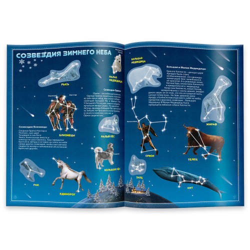 Атлас с наклейками "Звёздное небо" расширяет границы представлений о космосе, знакомит с картами звёздного неба и созвездиями, которые наблюдают в разное время года. В атласе даны легенды, связанные с названиями созвездий, рассказывается о способах наблюдения космоса.