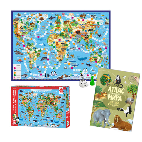 Пазл из 260 деталей содержит художественные изображения представителей флоры и фауны суши и океанов Земли. На карте даны названия материков, океанов, островов и других географических объектов, а животные и растения размещены в соответствии с их местами обитания.