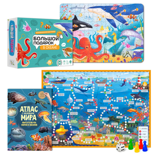 Любознательный ребёнок хочет знать всё о подводном мире? Большой подарок «В океане» поможет ему в этом! Пазл «Подводный мир» познакомит с самыми известными жителями морей и океанов. Атлас мира «Обитатели рек, морей и океанов» расскажет, какие необыкновенные, непохожие друг на друга создания живут в воде в разных уголках нашей планеты. А с игрой-ходилкой ребёнок сможет сам отправиться в путешествие и узнать тайны загадочных морских глубин. Играйте, собирайте, изучайте – проводите время вместе полезно и весело! Рекомендуемый возраст: 6+.