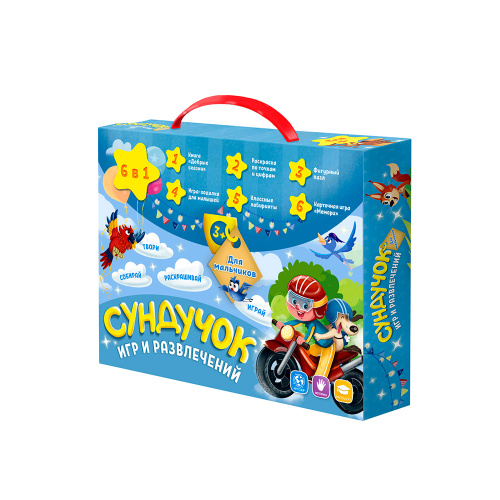 Юный герой стремится навстречу новым открытиям? Ему поможет сундучок игр и развлечений для мальчиков! Внутри – игра-ходилка, раскраска по точкам и цифрам, игра «Мемори», книжка «Классные лабиринты», книжка «Добрые сказки» и фигурный пазл «Зверотур». Такой набор станет отличным помощником в тренировке памяти и внимания, познакомит малыша с цифрами и счётом и поможет сделать первые шаги в мир творчества. Рекомендуемый возраст: 3+.