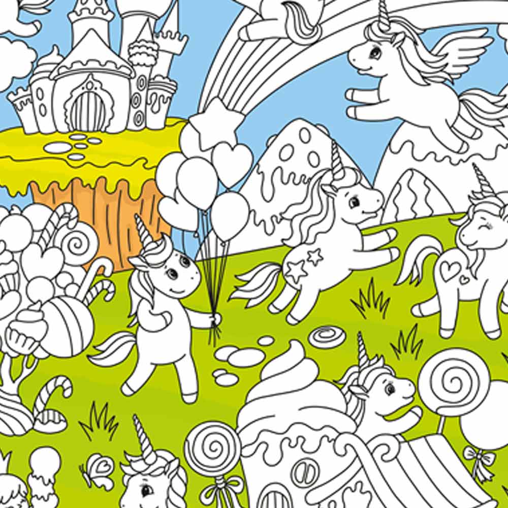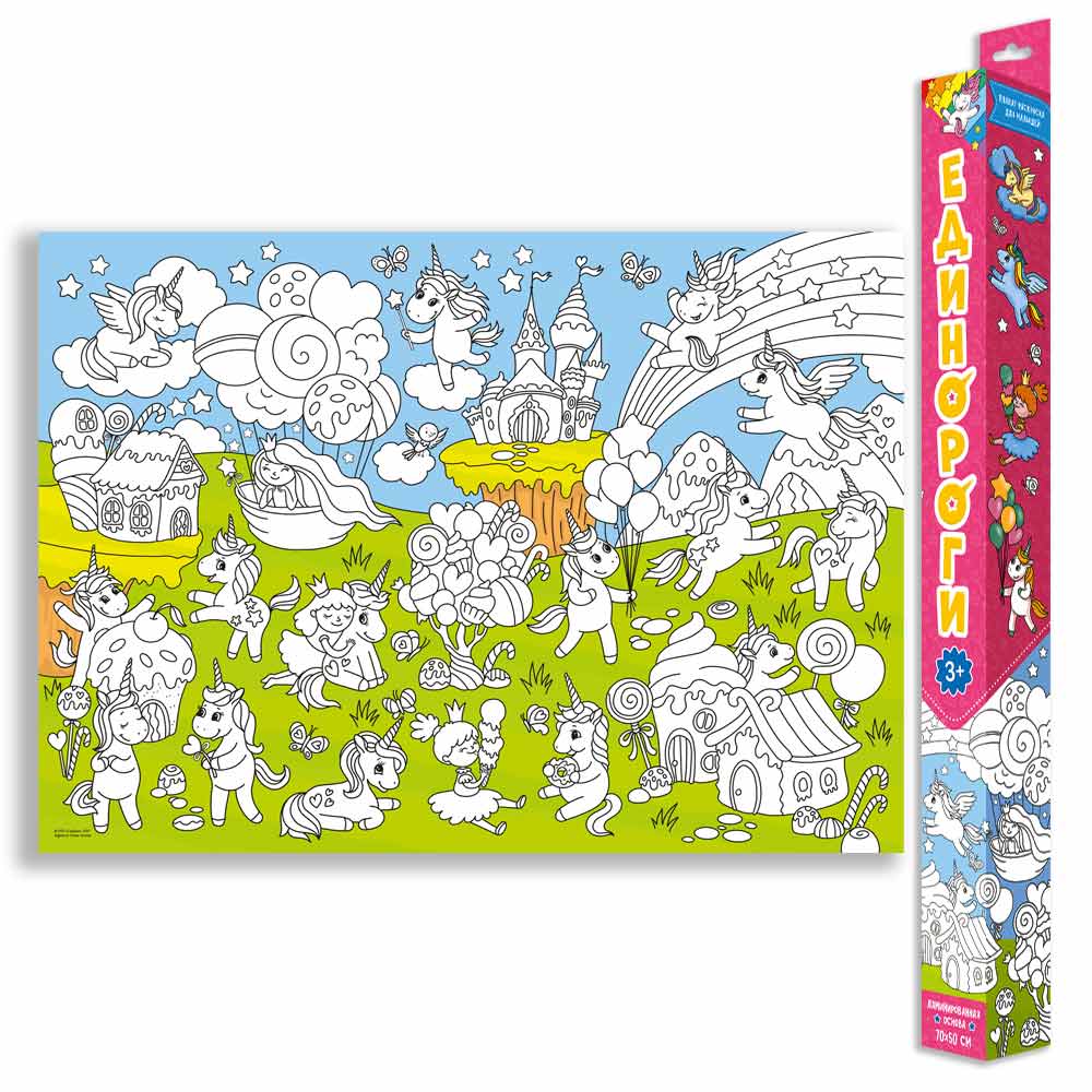 Этот очаровательный плакат-раскраска обязательно понравится маленьким художницам! В нём можно раскрасить в яркие цвета настоящий «мир мечты» с милыми единорогами, принцессами и морем сладостей.