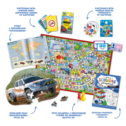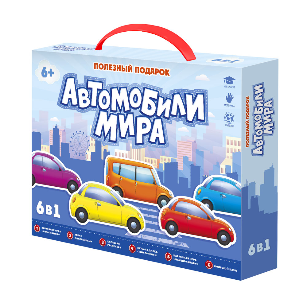 Подарочный набор «Автомобили мира» – это 6 в 1 для юных любителей машин! Внутри – всё, что нужно, чтобы познакомиться с миром захватывающих гонок и мощных машин: игра-ходилка с фишками «Гонки по правилам», карточная игра «Спроси меня. Дорожные знаки», атлас с наклейками «Автомобили», большая раскраска «Транспорт», карточная игра «Найди-схвати. Транспорт», пазл «Внедорожник». Полезный подарок поможет узнать новое и интересное об автомобилях! Читайте, играйте, собирайте – и проводите время вместе полезно и весело! Рекомендуемый возраст: 6+.