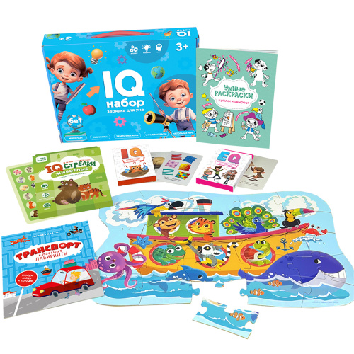 IQ-набор – это 6 в 1 для всестороннего развития ребёнка! С ним ребёнок освоит азы логики и математики, научится легко ориентироваться в пространстве и прокачает творческий и эмоциональный интеллект. В комплекте: 2 карточные игры серии «Игры для ума», настольная игра «IQ-стрелки», пазл на 25 деталей, раскраска и лабиринты. Рекомендованный возраст: 3+.
