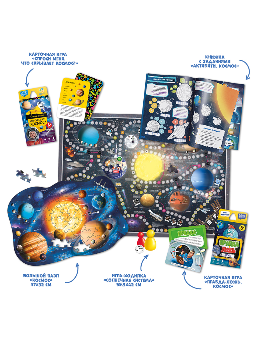 Ребенок мечтает разгадать все космические тайны? Полезный подарок. Тайны космоса. 5в1 - лучший выбор! Игра-ходилка и две карточные игры с различными механиками и форматами не дадут юному космонавту заскучать! А книжка с заданиями «Активити. Космос» расскажут всё о Солнечной системе и её планетах. Большой и красочный пазл развлечет ребенка в самостоятельном времяпрепровождении. Рекомендуемый возраст: 6+.