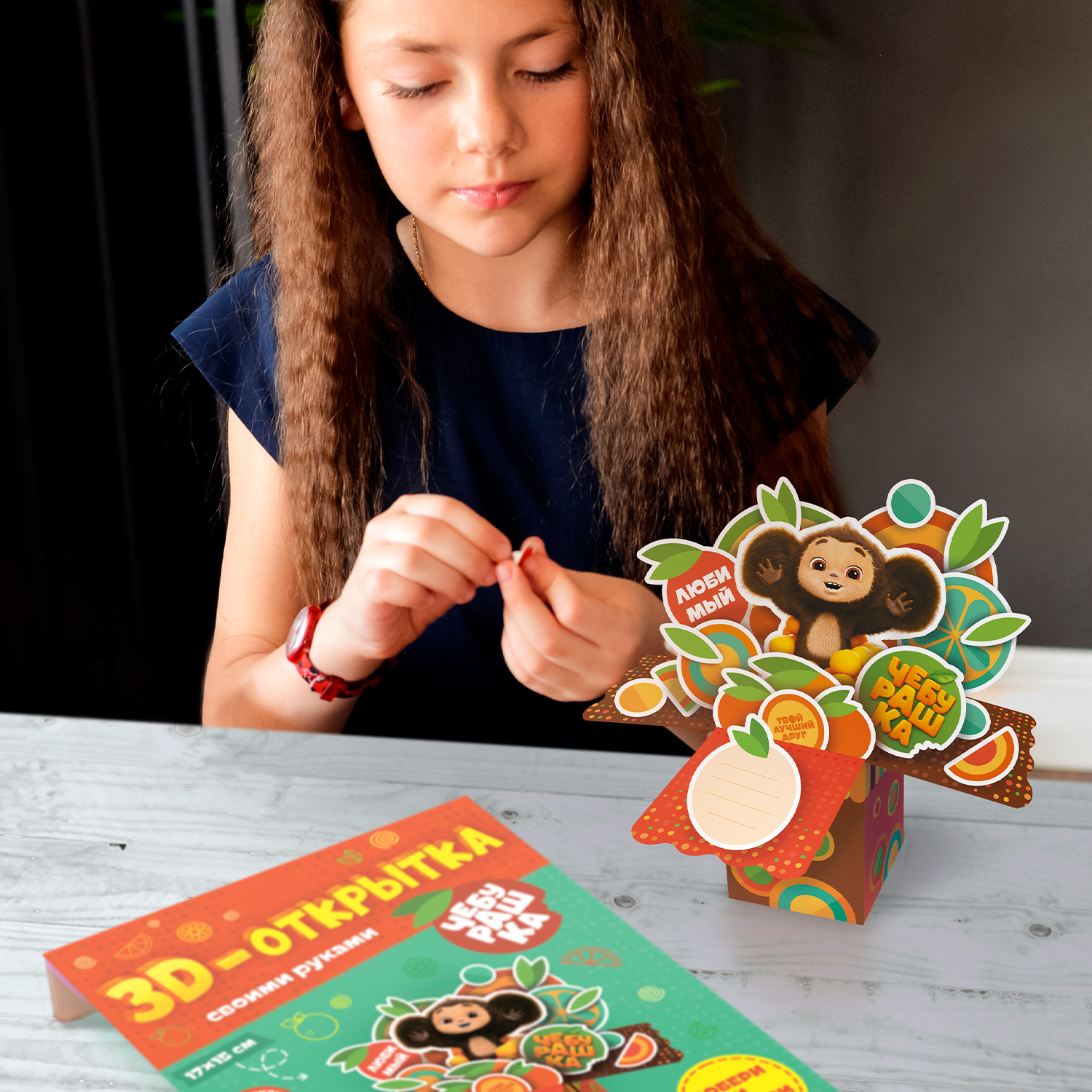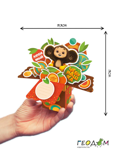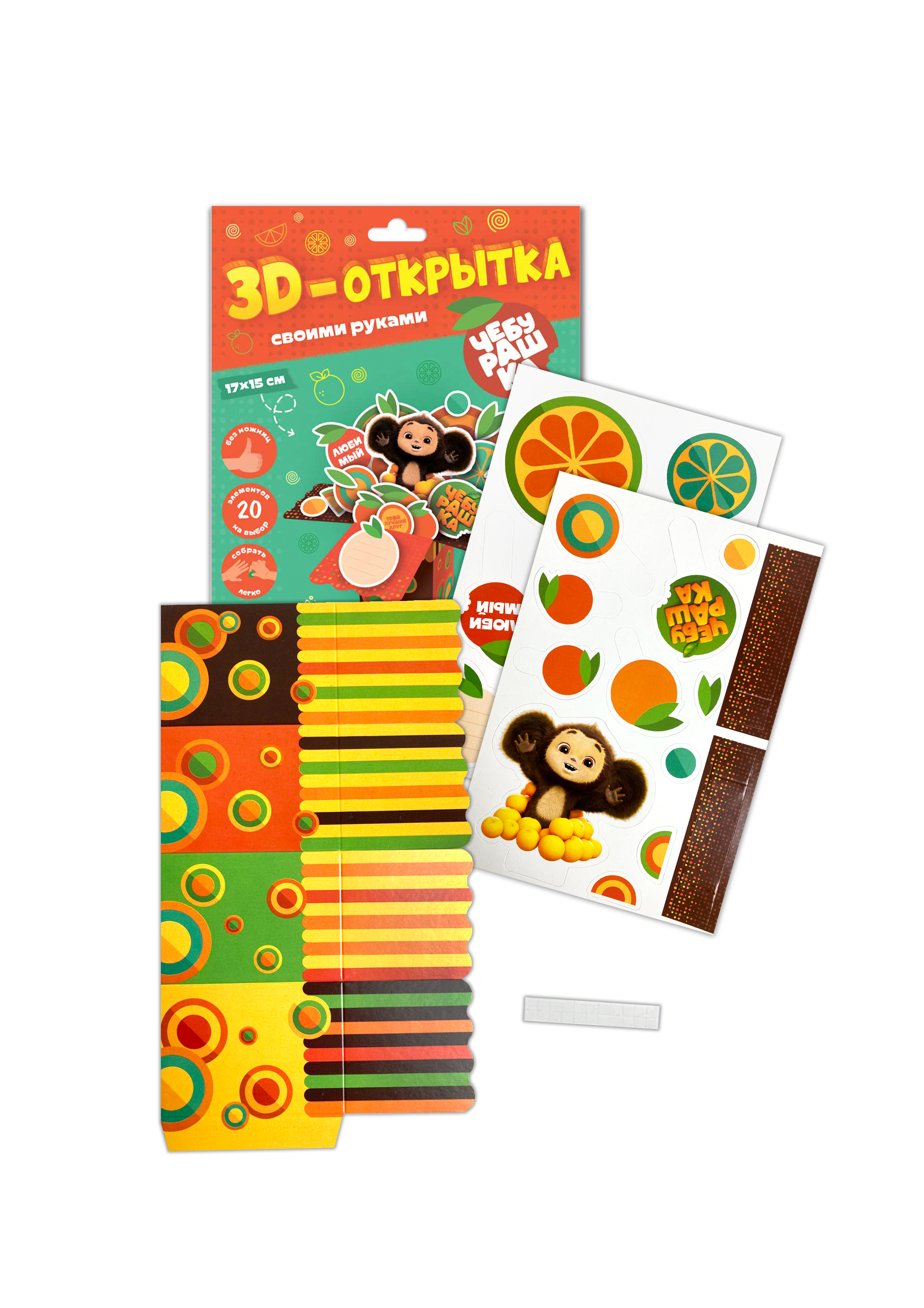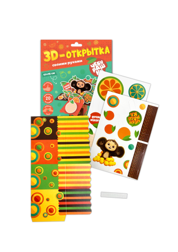 Креативный подарок с любимым героем Чебурашкой – своими руками! Сделайте необычную открытку-коробочку без помощи ножниц. В наборе 20 ярких элементов, клеевые подушечки и простор для фантазии! Сделать 3D-открытку поможет пошаговая инструкция – посмотри, собери и удиви родных и близких оригинальным подарком! Набор для творчества развивает мелкую моторику, воображение и творческое мышление. Рекомендованный возраст: 3+.