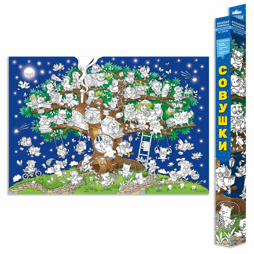 Здесь на каждом шагу озорные и удивительные совы. Ребенок смело сможет прокатиться на роликах с совятами и посмотреть на луну с совенком-звездочетом. Понаблюдать за совами-пекарями, позавтракать с важным семейством и сходить на урок совиной музыки. Для этого понадобятся только карандаши и фломастеры. Фон раскраски частично окрашен в цвет, что делает процесс раскрашивания очень увлекательным. Большая раскраска объединяет большие компании и семьи, места хватит всем.