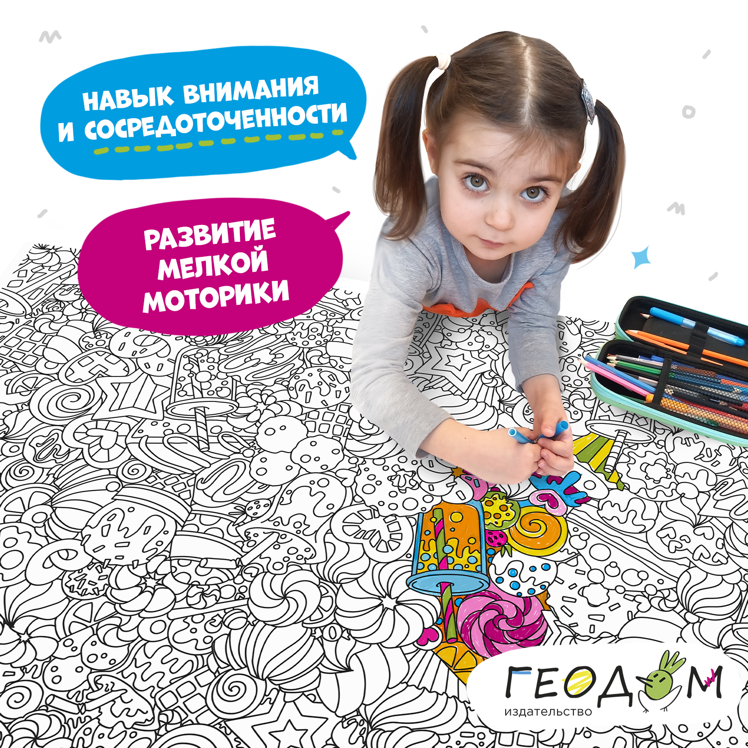 Большая раскраска-дудл – это увлекательное путешествие в мир сладостей! Мороженое и шоколад, пончики и леденцы – на рисунке больше 100 любимых лакомств сладкоежек! Раскраска-дудл снимает усталость и повышает настроение, развивает воображение, внимание и творческие способности. Раскрашивайте, фантазируйте и путешествуйте по вкусному и волшебному миру сладостей! Рекомендованный возраст: 6+
