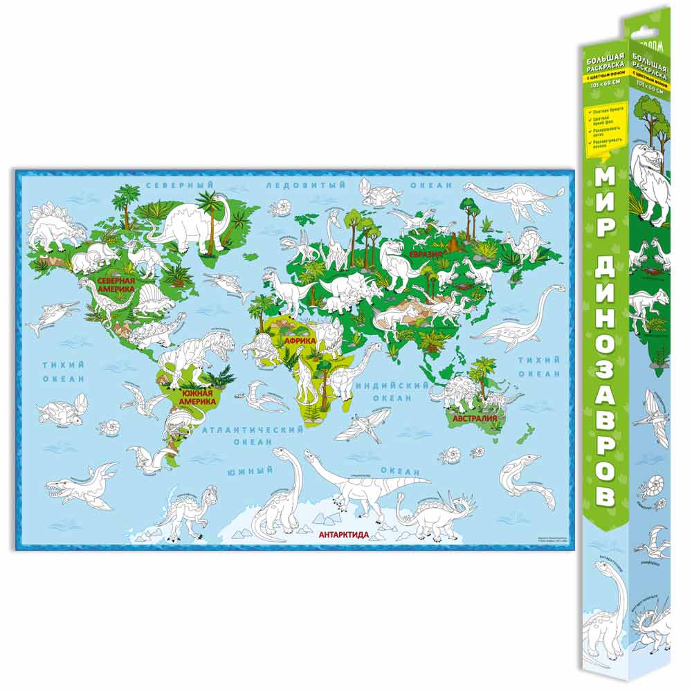 Предлагаем вашему вниманию Большую раскраску «В мире динозавров» форматом 101*69 см. Виды динозавров на раскраске расположены таким образом, что можно понять, на каком материке в современном мире их можно было бы встретить. Подходит для фломастеров, карандашей, гуаши, акварельных красок и всего остального. Частично закрашенный фон.