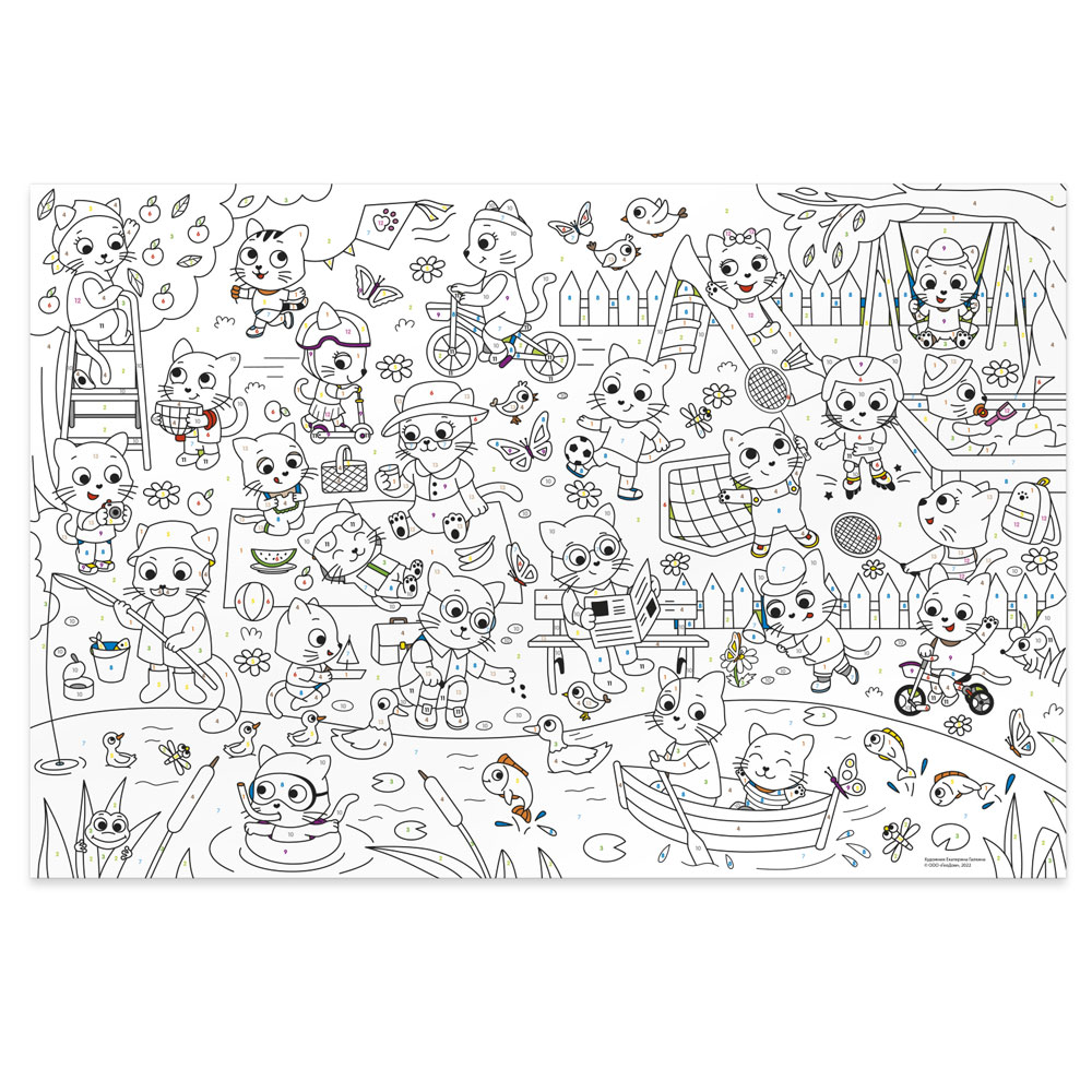 Большая раскраска по цифрам – увлекательное путешествие в мир творчества, полезное развлечение и весёлое учение! Будьте внимательны: у каждой цифры – свой цвет. Возьмите карандаши или фломастеры, следуйте подсказкам – и увидите, как веселятся забавные котики! Раскраска по номерам помогает тренировать мелкую моторику, внимание и усидчивость, изучать цвета и цифры, готовить руку к письму. А готовую работу можно повесить на стену и украсить комнату. Рекомендованный возраст: 4+.