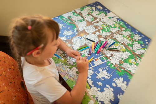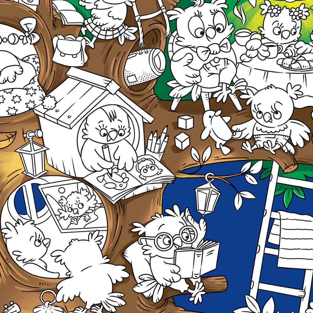 Здесь на каждом шагу озорные и удивительные совы. Ребенок смело сможет прокатиться на роликах с совятами и посмотреть на луну с совенком-звездочетом. Понаблюдать за совами-пекарями, позавтракать с важным семейством и сходить на урок совиной музыки. Для этого понадобятся только карандаши и фломастеры. Фон раскраски частично окрашен в цвет, что делает процесс раскрашивания очень увлекательным. Большая раскраска объединяет большие компании и семьи, места хватит всем.