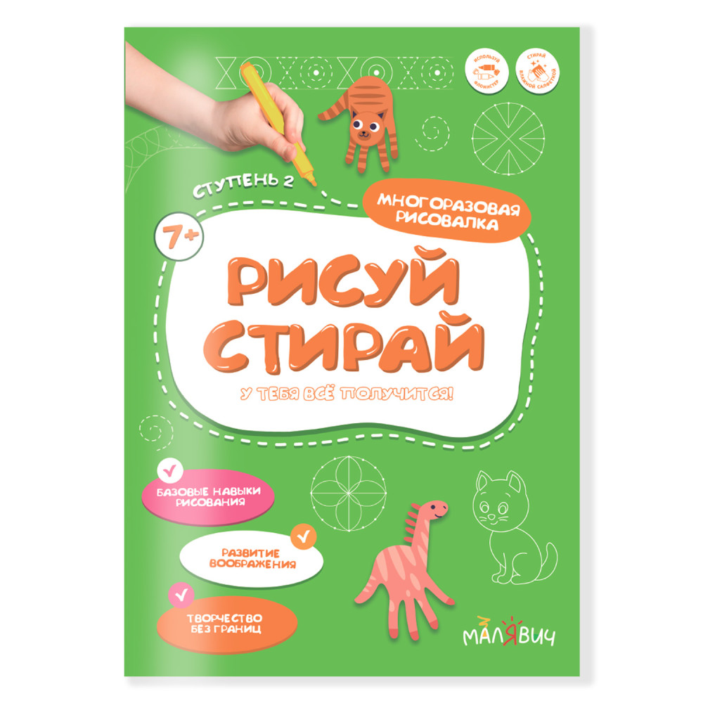 «Рисуй-стирай» – это многоразовая рисовалка для детей младшего школьного возраста. Для рисования используется фломастер на водной основе, который легко стереть с покрытия влажной салфеткой. Обучающие и занимательные упражнения даны по принципу от простого к сложному. В тетради второй ступени ребёнок обводит линии и орнаменты, повторяет и придумывает узоры по заданным образцам и учится легко рисовать шаг за шагом.